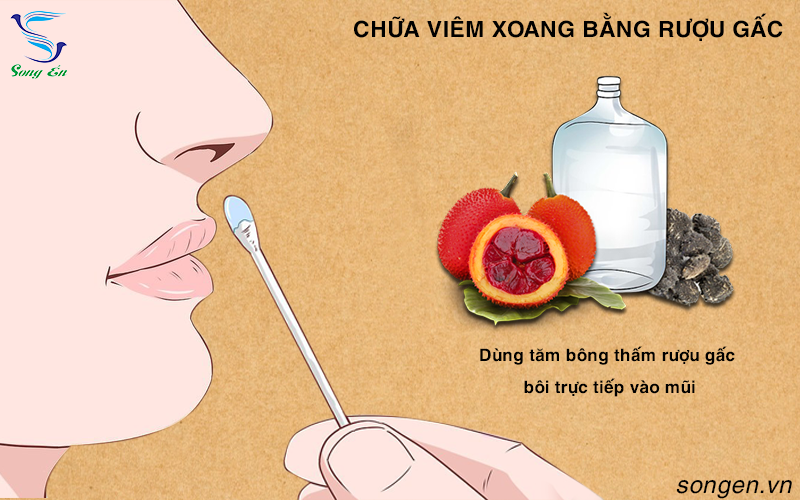 Đó là bạn dùng miếng bông gòn dài thấm rượu gấc đều sau đó đắp lên thành mũi (kéo dài từ vị trí giữa 2 mắt cho đến hết mũi) trước khi đi ngủ. Điều này vừa giúp mũi thông thoáng để bạn đi vào giấc ngủ dễ dàng hơn vừa hỗ trợ điều trị dứt điểm viêm xoang lâu dài.